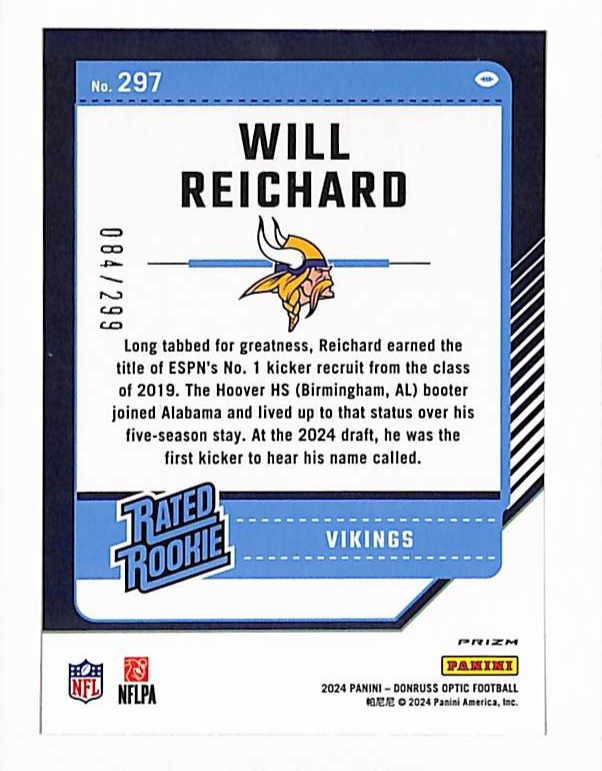 2024 Panini Donruss Optic - Rated Rookie Will Reichard #297 Blue Prizm /299 (RC)